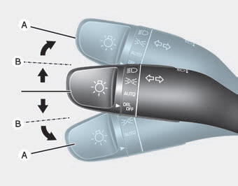 Чтобы сигнализировать о повороте, нажмите на рычаг вниз для левого поворота или вверх для правого поворота в положении (А). Чтобы подать сигнал о смене полосы движения, слегка переместите рычаг указателя поворота и удерживайте его в положении (B). Рычаг вернется в положение OFF при отпускании или когда поворот завершен.